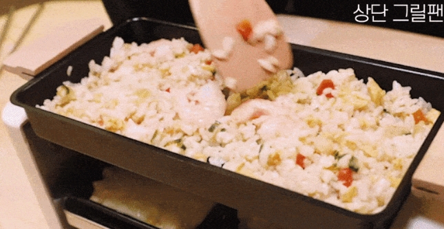 이런 식으로 상단 그릴팬은 볶음밥, 고기, 소시지 등을 굽는 데 사용하고