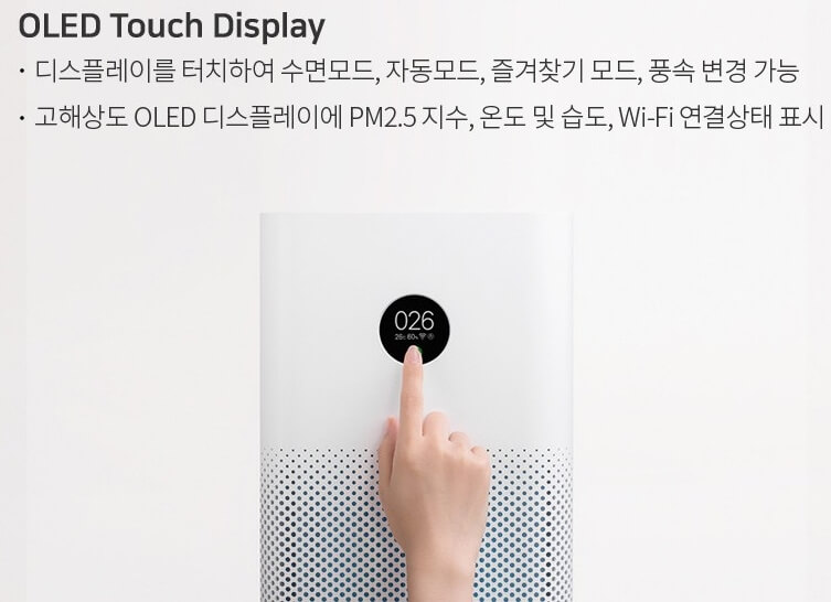 또 Google Assistant와 Amazon Alexa가 협력하여 미 홈 어플 등을 활용하여 공기 상태, 컨트롤을 스마트하게 다룰 수 있으며 OLED Touch Display를 탑재하여 디스플레이 터치 시 수면모드, 자동모드, 즐겨찾기 모드, 풍속 변경 가능 등 다양한 기능을 즐길 수 있으며 디스플레이에 PM2.5 지수, 온도, 습도 등이 표시된답니다.