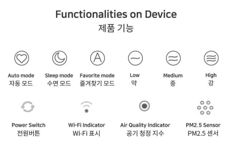 제품의 기능은 3가지의 공기청정 모드와 세기를 조절하는 기능, 공기 지수를 확인하는 기능 등 다양한 기능이 들어있고