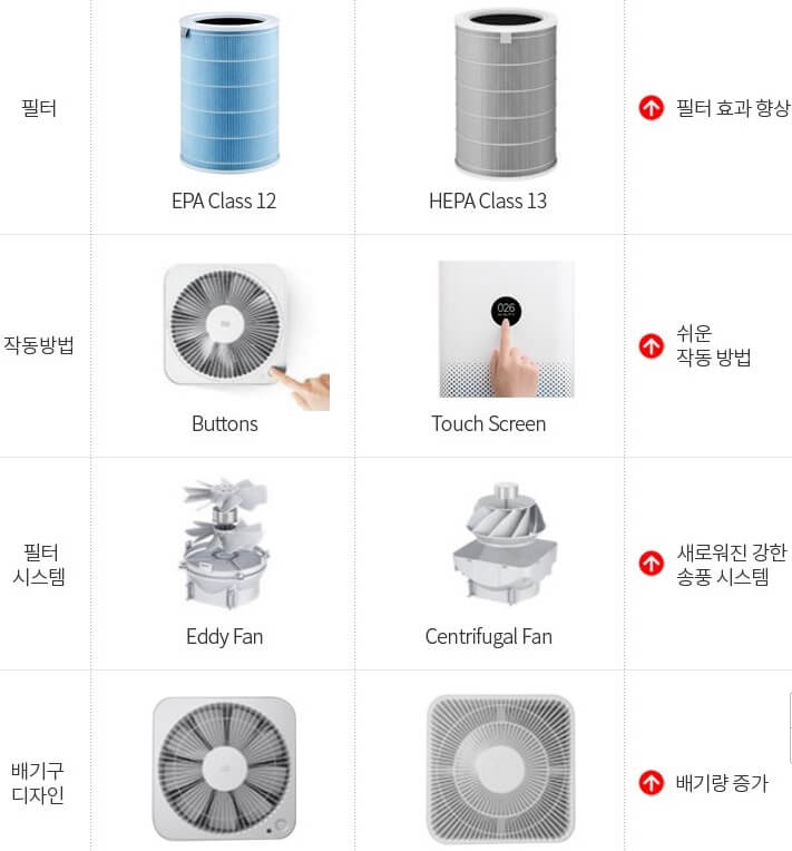 기존의 샤오미 미 에어 공기청정기 2S와의 비교를 해보면 정화능력, 상용 면적, 필터 시스템, 디자인 등 다양한 기능들이 업그레이드 되어 샤오미 미에어 공기청정기 3H, 더욱더 가성비 끝판왕으로 돌아온 것을 볼 수 있습니다.