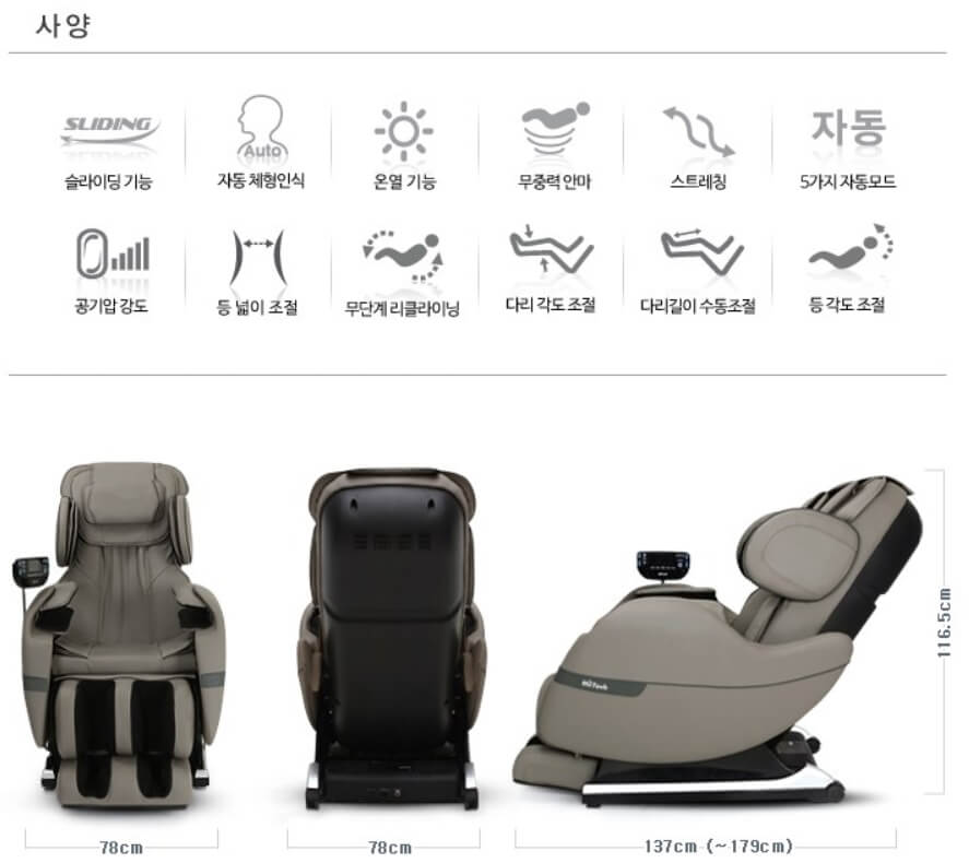 어깨위치 자동 탐지를 위한 마그네틱 센서를 탑재하여 사용자의 체형을 자동으로 인식해 체형별 맞춤 마사지를 받으실 수 있고 무단계 전동 리클라이닝 방식으로 디테일한 각도 조절까지 가능합니다.