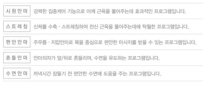 자동프로그램을 탑재하여 몸 컨디션에 따라 원터치로 간편한 전신 마사지를 받을 수 있습니다.