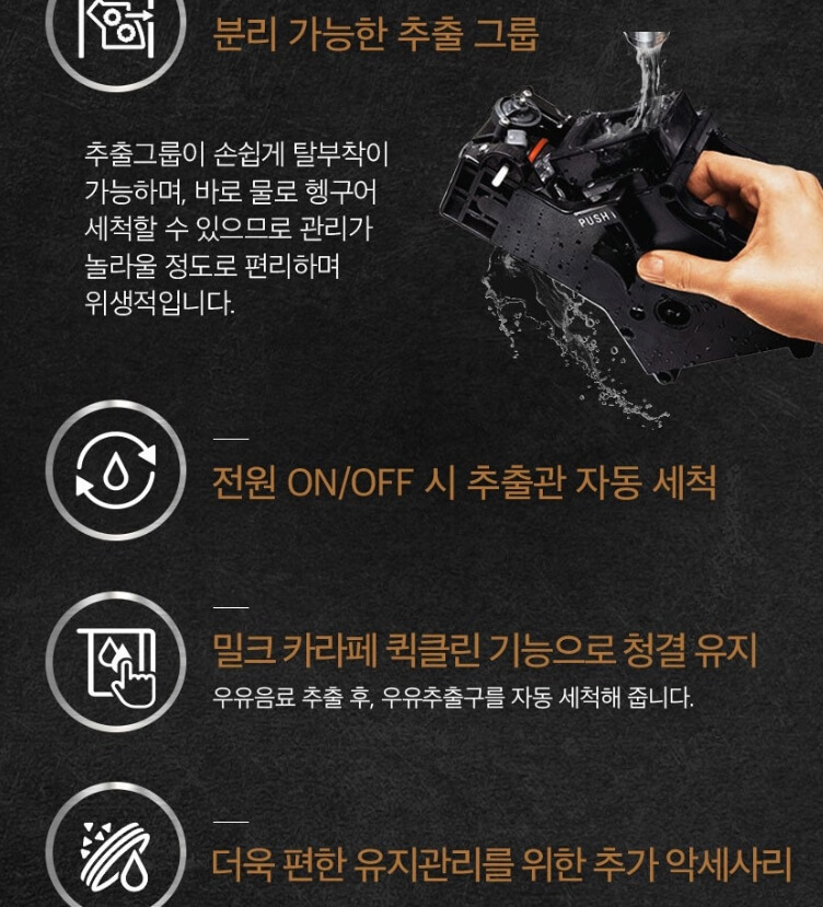 분리 가능한 추출 그룹과 전원 ON/OFF 시 추출관 자동 세척,