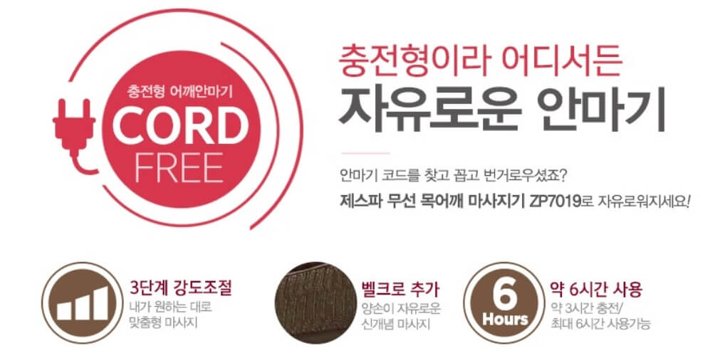 제스파 목 어깨 마사지기 ZP7019는 충전형이라 어디서든 자유로운 안마를 받으실 수 있으며