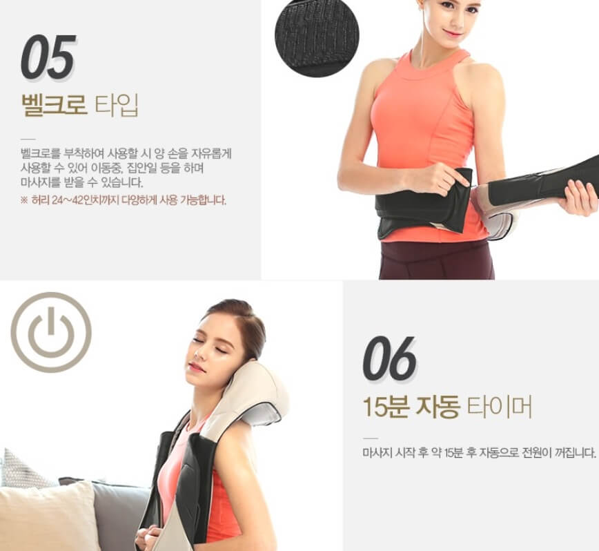 추가적으로 크게 온열 기능 정방향/역방향 회전 기능, 벨크로 타입, 15분 자동 타이머 기능이 있는데